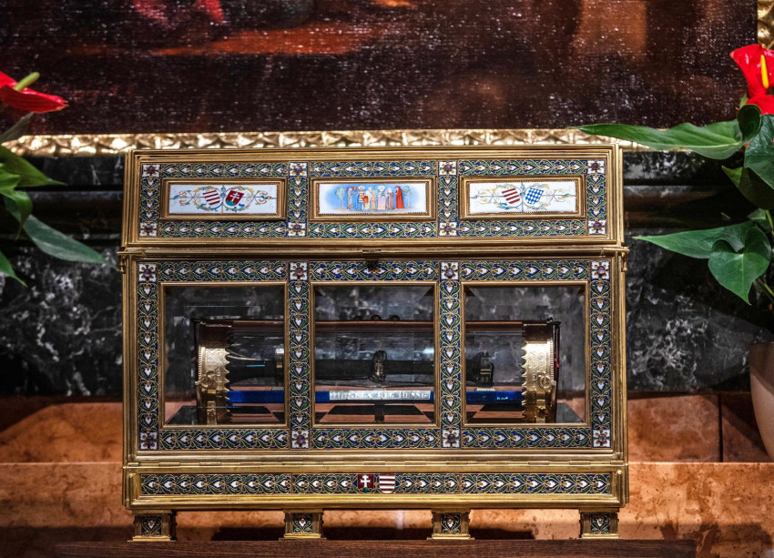 „A keresztény államiság kialakulását idézik fel a barokk korban épült, államalapítónknak szentelt ferences templom mennyezetképei. A karzaton Szent Imre herceg fogadalomtétele tűnik fel, a hajó feletti részben pedig az a jelenet látható, amikor Szent István fogadja a pápa követeit, és megkapja a koronát. A pápa másik ajándéka Istvánnak az apostoli kettős kereszt, amellyel a királyt apostolnak ismeri el a magyar nép megtérítése miatt. A mennyezetre festett történet további részleteit a várnegyedbéli túrákon ismerhetik meg az érdeklődők” – tette hozzá Nagy Veronika.